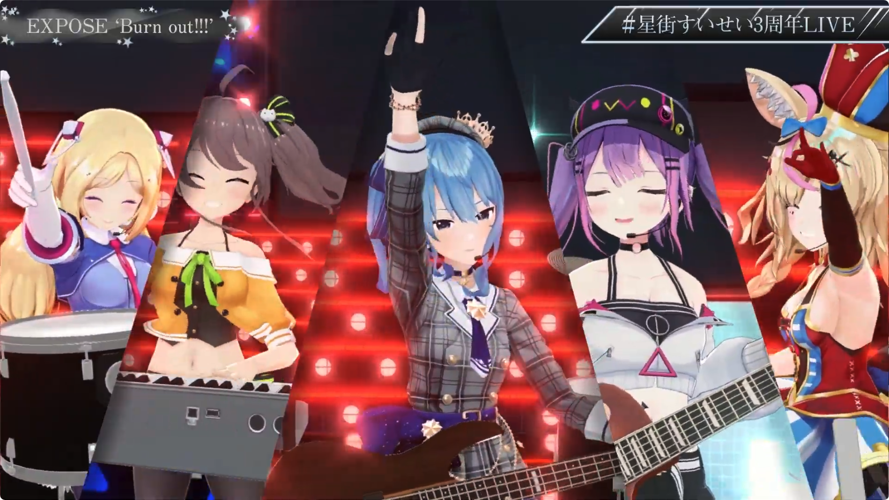 而Holoband的形式和人选则更加能体现出阿星的把关能力。从吸引观众的角度来看,Guest更多显然更加有利。然而一方面木口可能都没有那么多水平足够和阿星对唱的人;另一方面,假如采取对唱为主的方式,那势必会压缩星solo的曲目数。假如采取大家一起上的合唱,又会出现上文提到的喧宾夺主的问题。若是向佐贺一样全员只负责和声,大张旗鼓的叫一帮人来3D似乎欠妥。但是Holoband成功解决了这一问题。这一组合一次性带来了4位guest,乐队成员分工与RAS完全一致。每位成员均负责一种乐器(调音台也是乐器(暴论)),星同时负责主唱,其余成员和声为主。这个分工可以最大程度突出星的vocal,同时也能给每位guest展现自己的空间。这种新鲜的演出方式(至少在木口社内)也足以让粉丝激动不已,加上这种偏摇滚的乐队配置本身自带燃起来的属性,成功将live的气氛推向高潮。