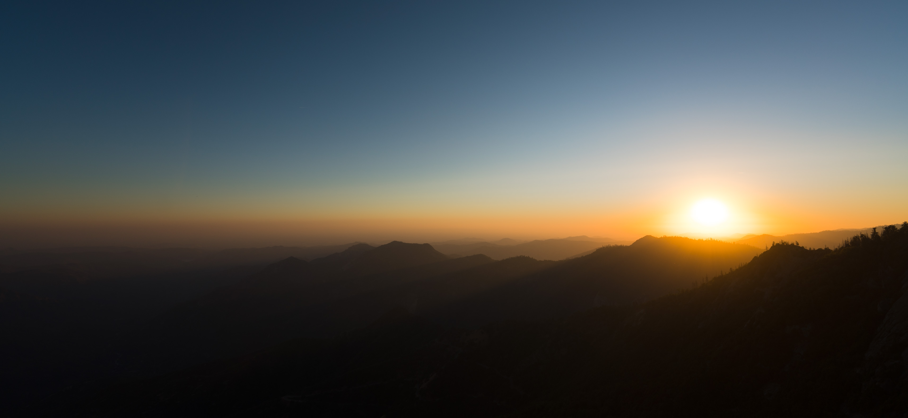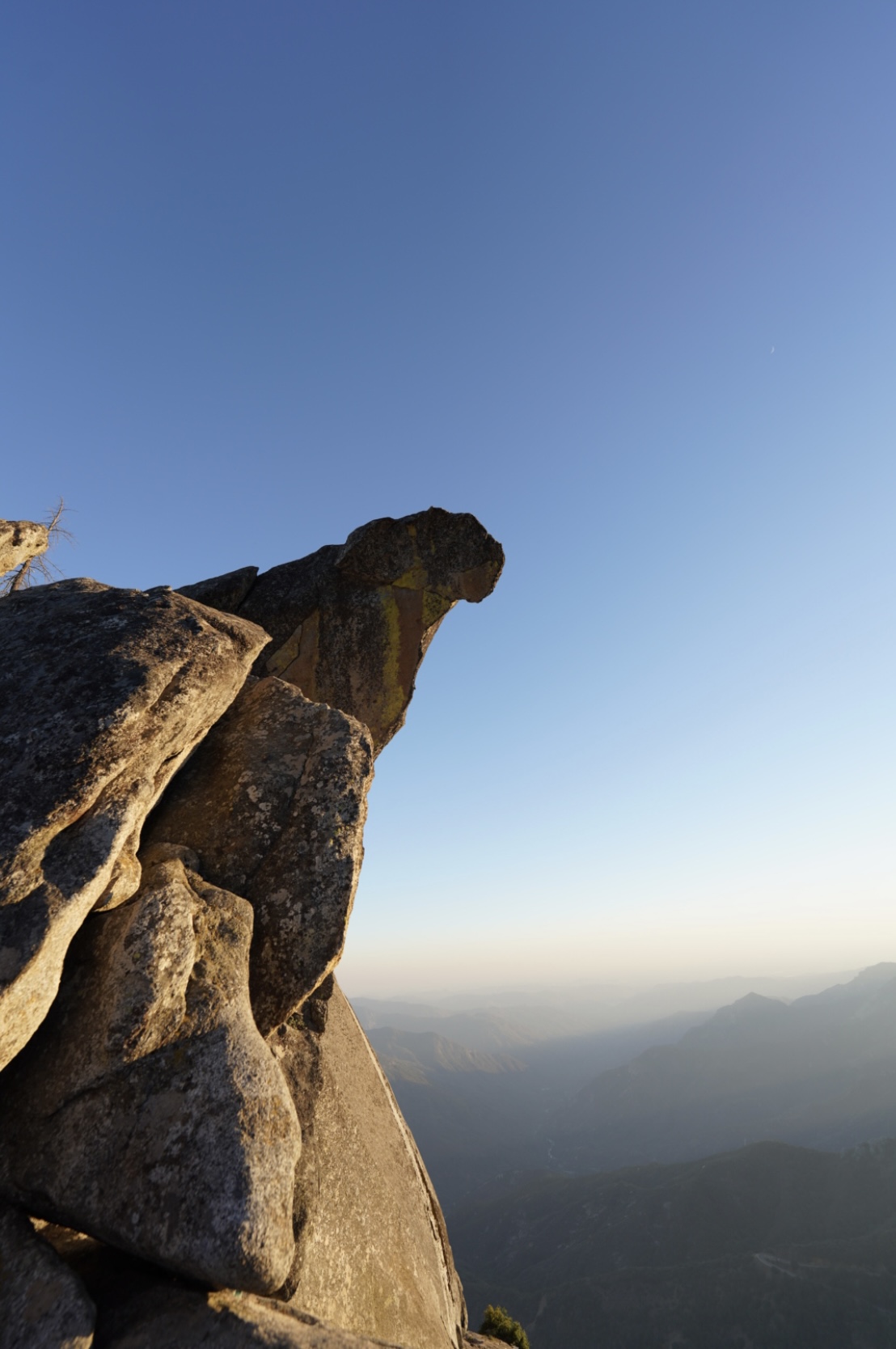这座公园给我最大的惊喜莫过于Moro Rock的日落了。Moro Rock是一块耸立在山麓的巨石,有陡峭的步道可以通顶。步道两侧有风蚀而成的怪石,而登上石山顶部则可尽享一览众山小的壮阔景象。左侧是夕雾中朦胧的群山剪影,右侧则是在落日余晖中被染得由金至粉连峰。