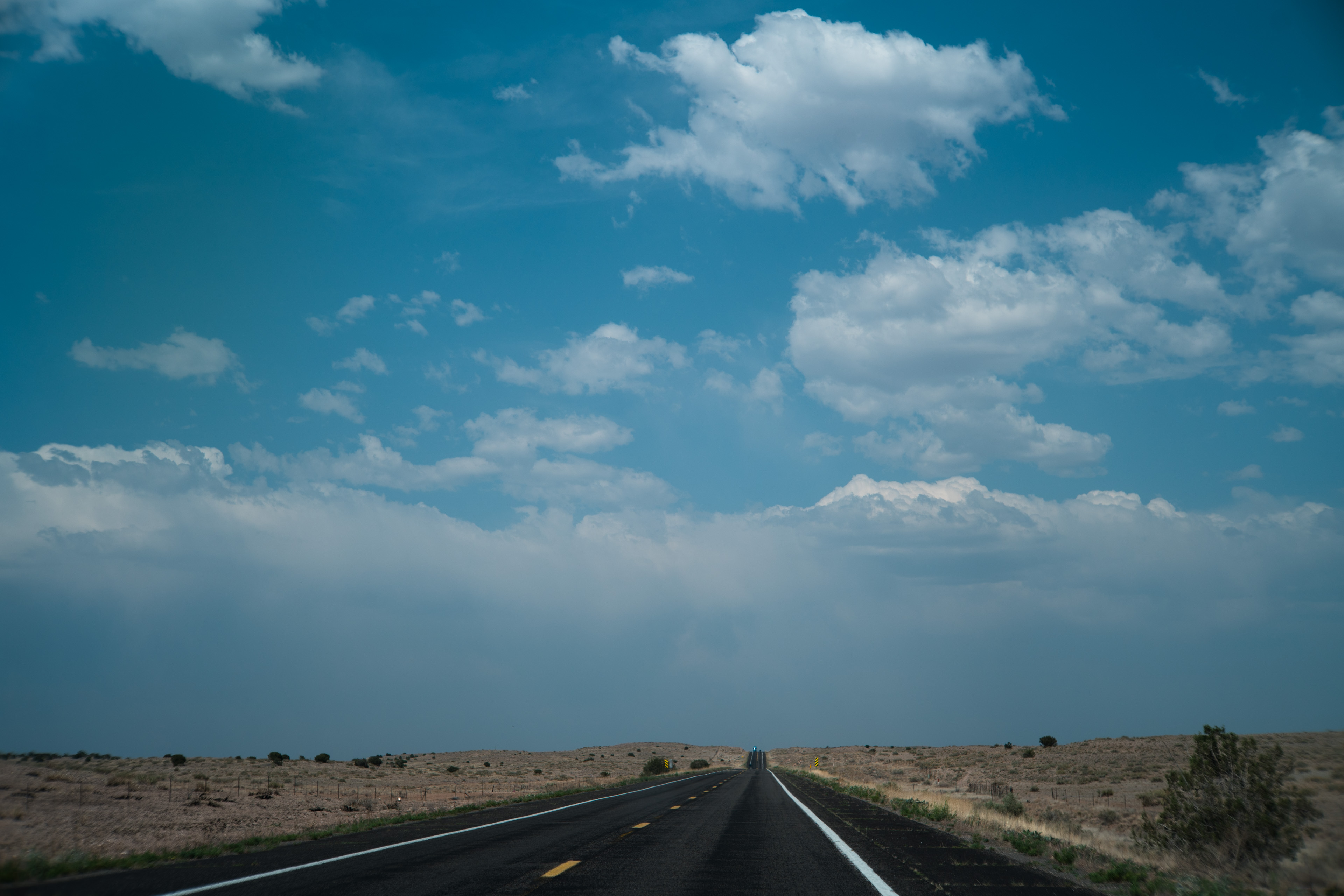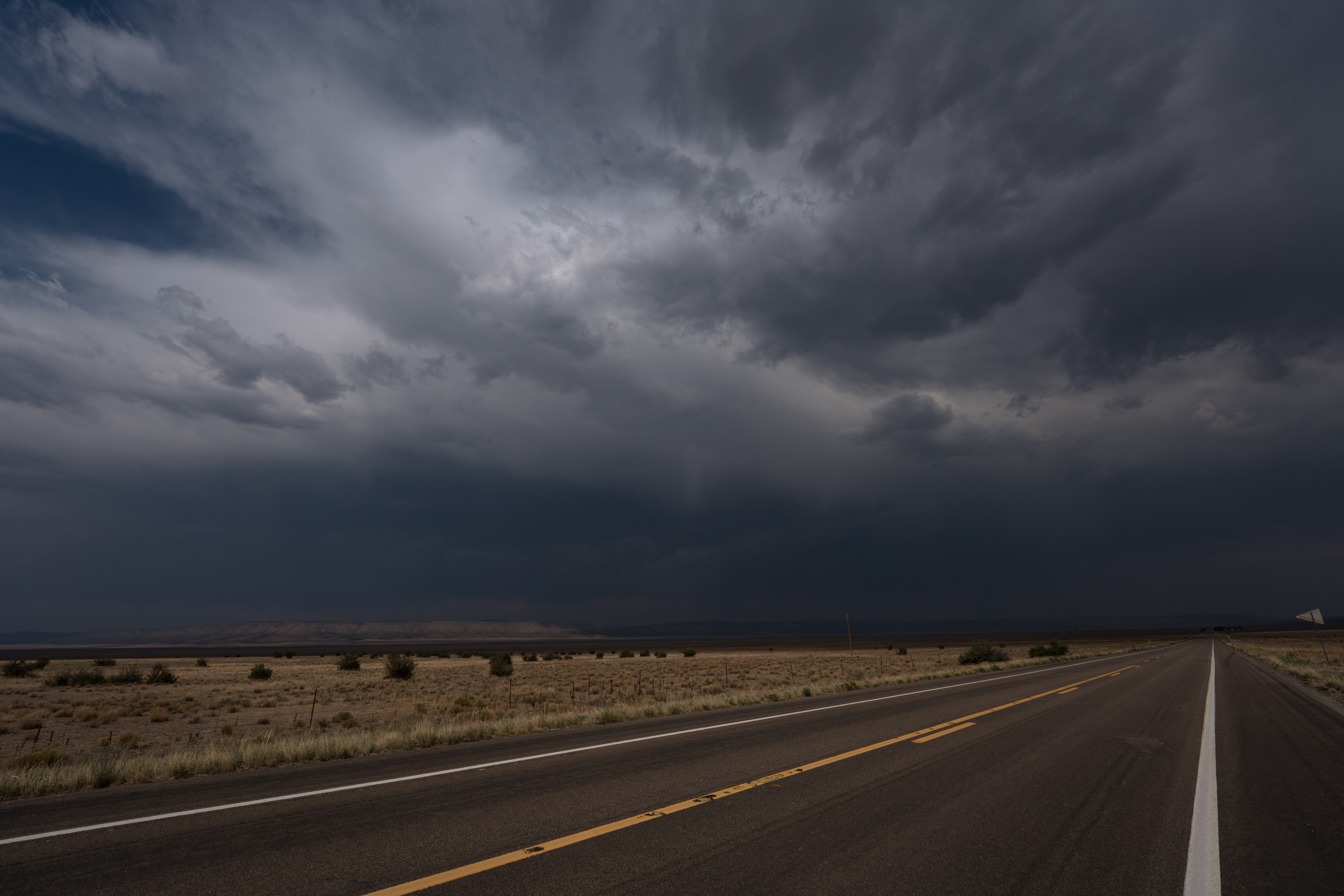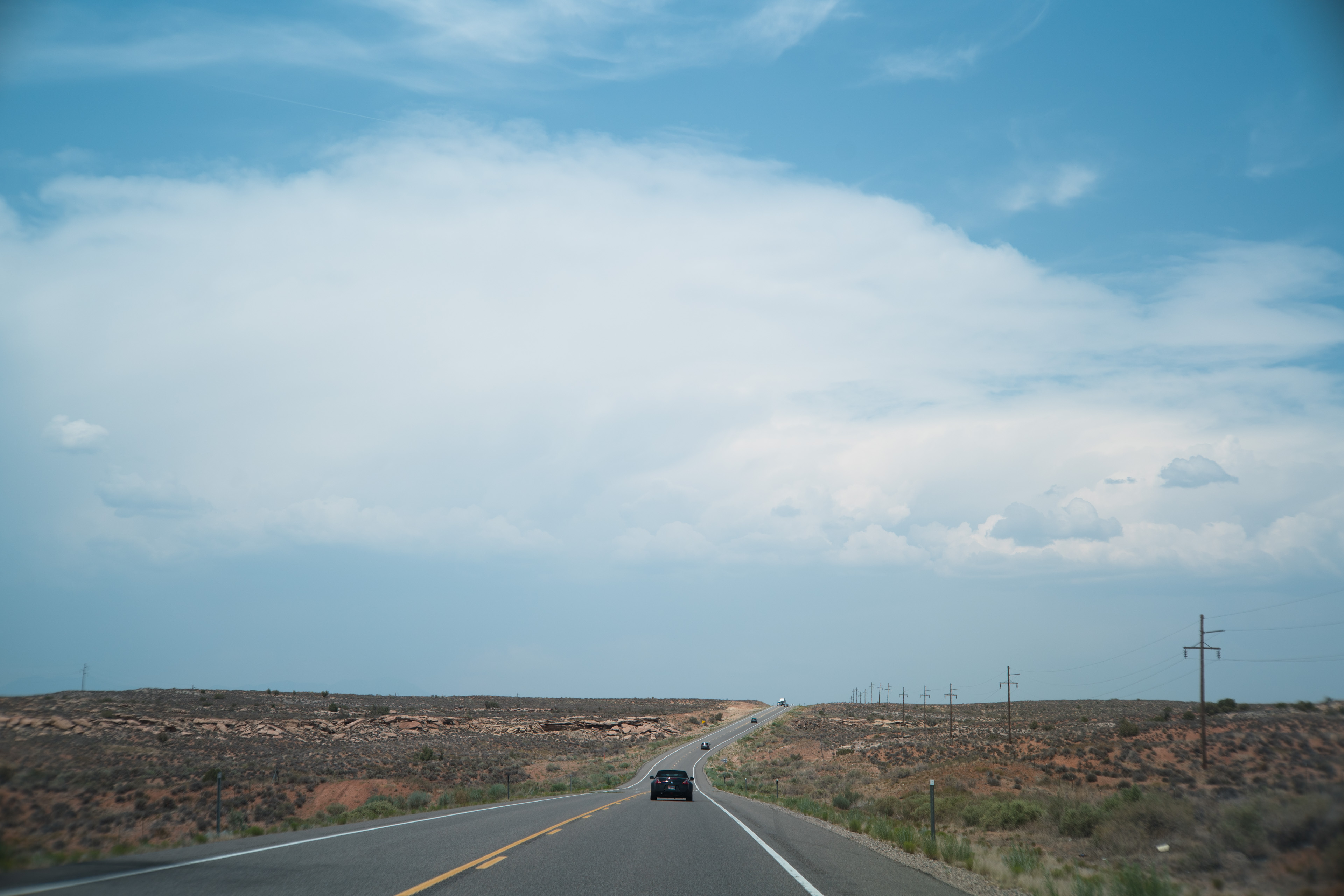 死亡谷下一站是大峡谷,途中在拉斯维加斯短暂停留,然后穿过亚利桑那Kingman的66号公路遗迹。随着车辆穿出科罗拉多沙漠,地貌从荒漠渐渐过渡成了草甸。随着州际公路的建成,这条象征着美国梦的公路也渐渐破败。不过,不少州都将其中一小段道路作为历史经典保留下来,供人感受当年走在这条路上的人在荒野中的孤独与对远方的希望。其间风云骤起,瓢泼大雨下甚至连行车都有些困难。