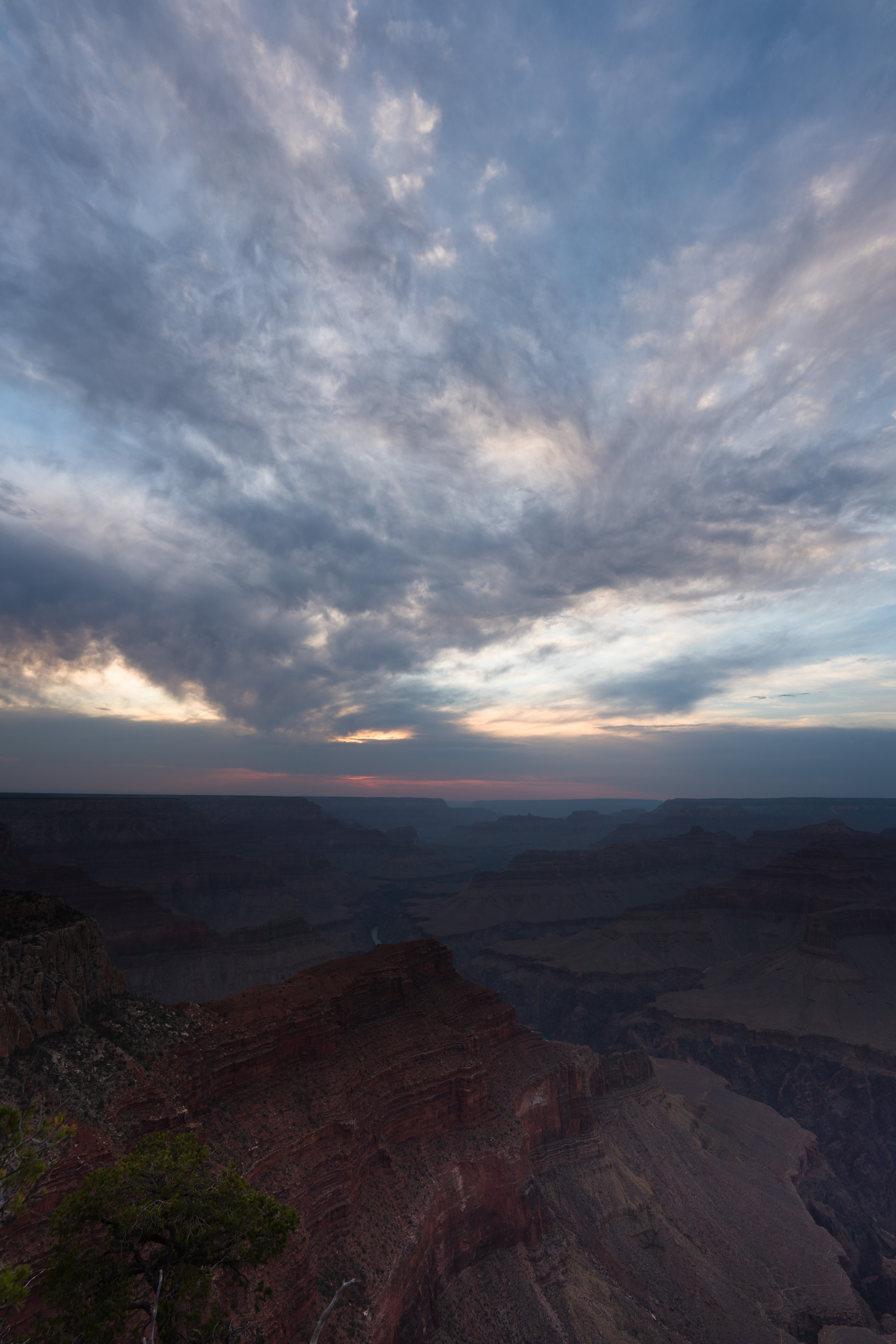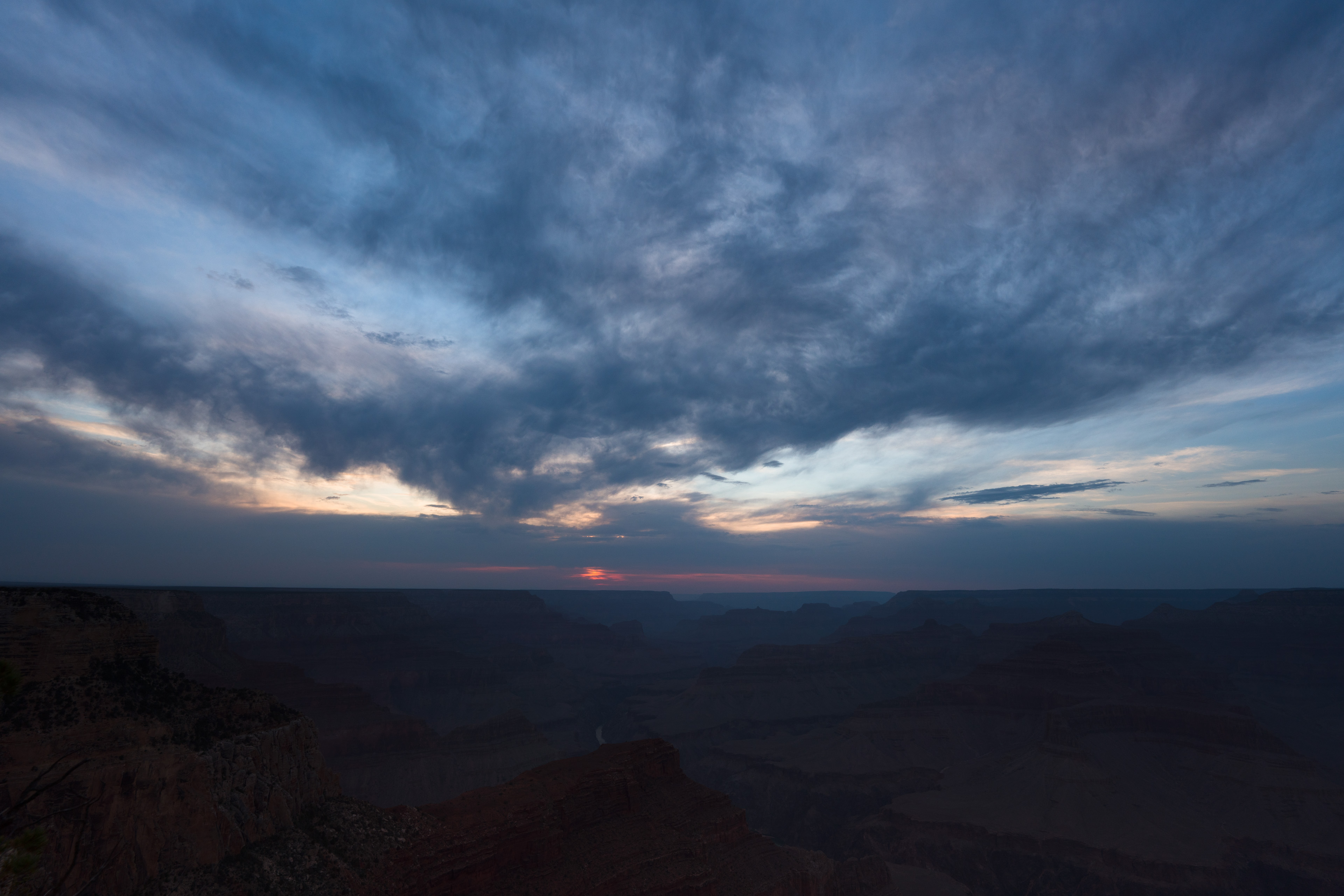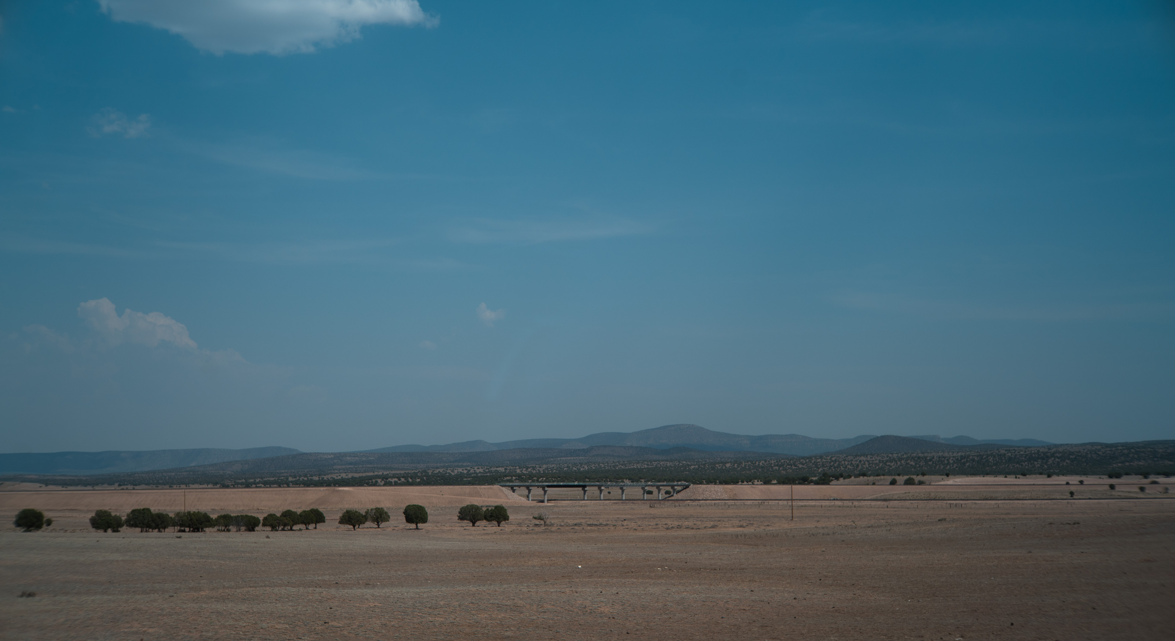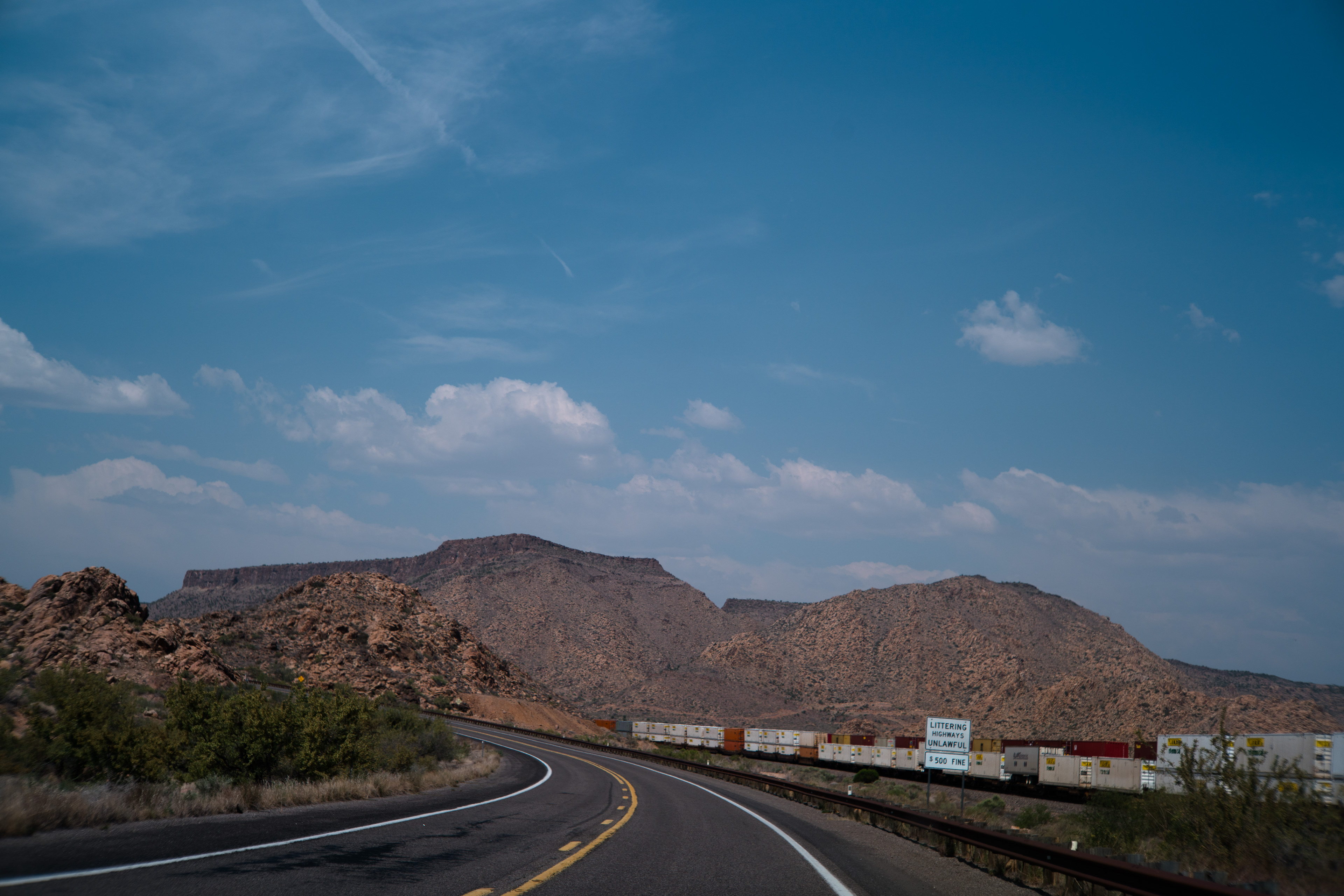 死亡谷下一站是大峡谷,途中在拉斯维加斯短暂停留,然后穿过亚利桑那Kingman的66号公路遗迹。随着车辆穿出科罗拉多沙漠,地貌从荒漠渐渐过渡成了草甸。随着州际公路的建成,这条象征着美国梦的公路也渐渐破败。不过,不少州都将其中一小段道路作为历史经典保留下来,供人感受当年走在这条路上的人在荒野中的孤独与对远方的希望。其间风云骤起,瓢泼大雨下甚至连行车都有些困难。