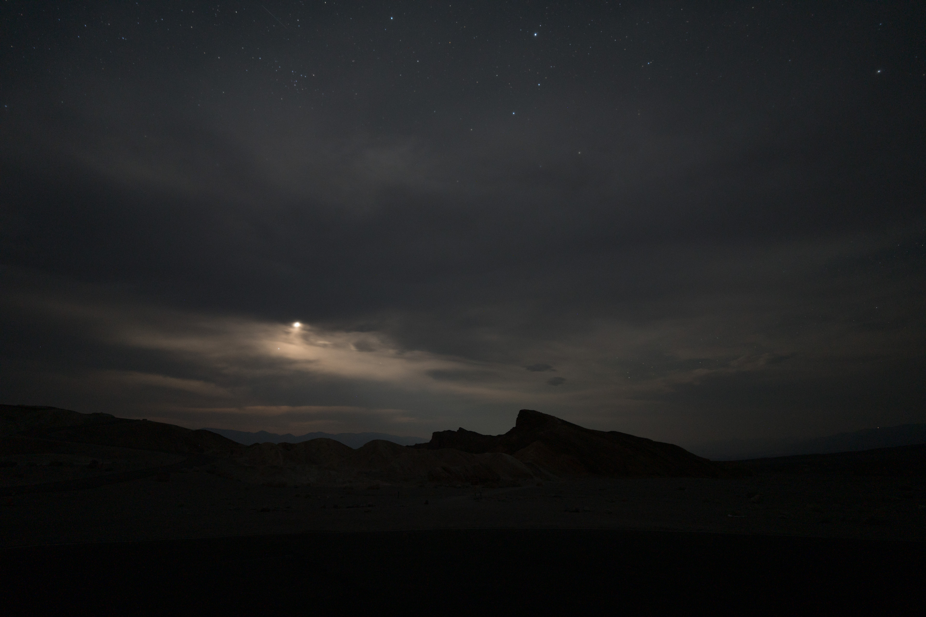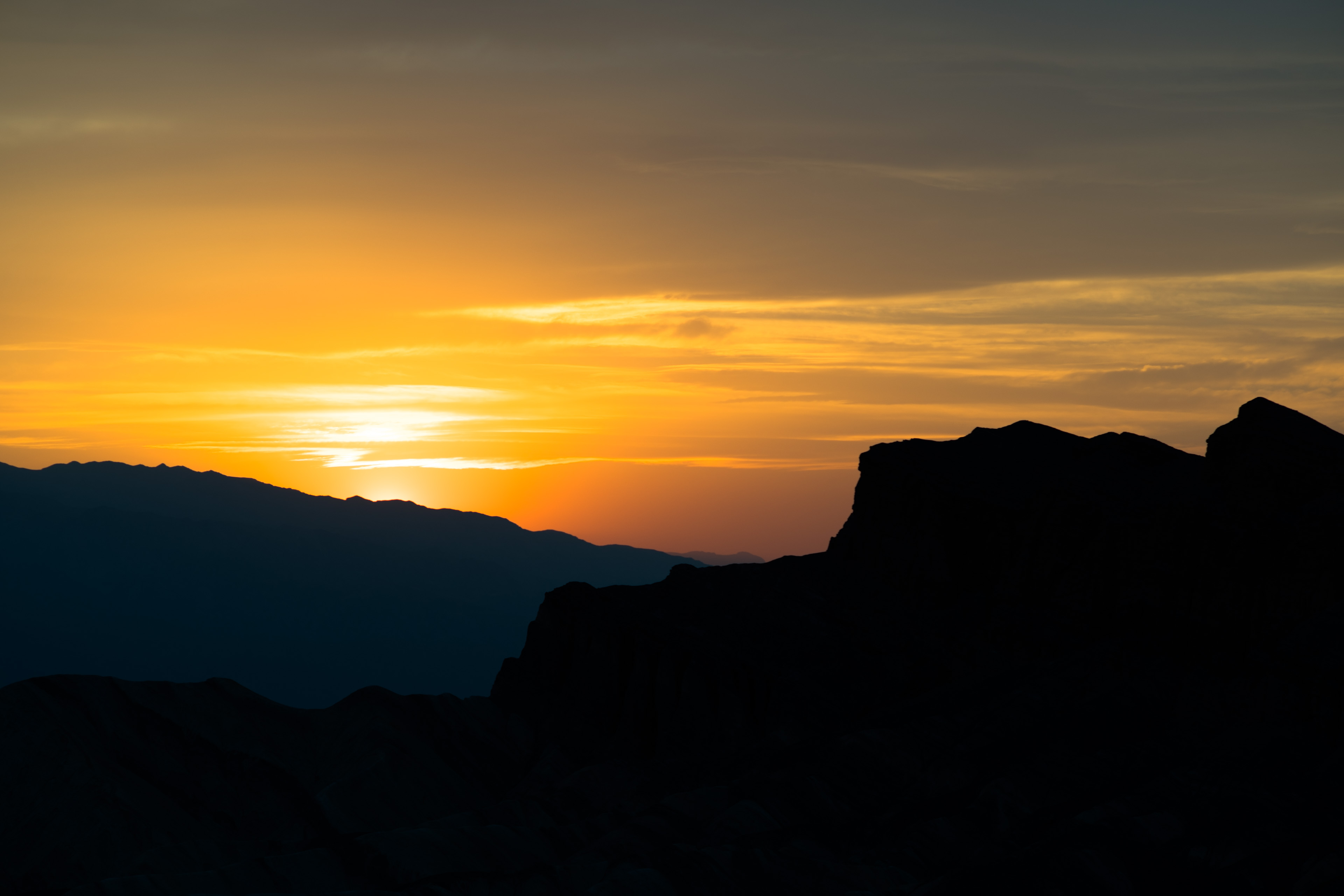 离开巨杉国家公园后,我们选山道穿过巨杉国家森林,一路下山,再次到访北美大陆最低点死亡谷。上一次前来死亡谷的时候遇上妖风,除了沙尘遍天以外,久闻其名的酷暑也没能体会得到。这次倒是正好赶上公园有史以来前五的极端高温,车载温度计度数达到了54摄氏度,气象台读数也超过了50摄氏度。没有风吹时还好,有风的时候就仿佛在空气炸锅里呼吸,完全喘不上气来。不幸的是天公依旧不作美,这次赶上了死亡谷少有的多云天。不过多云也能带来更加流光溢彩的日落景色,园内Zabriskie Point的日落甚至是MacOS的默认桌面之一。
