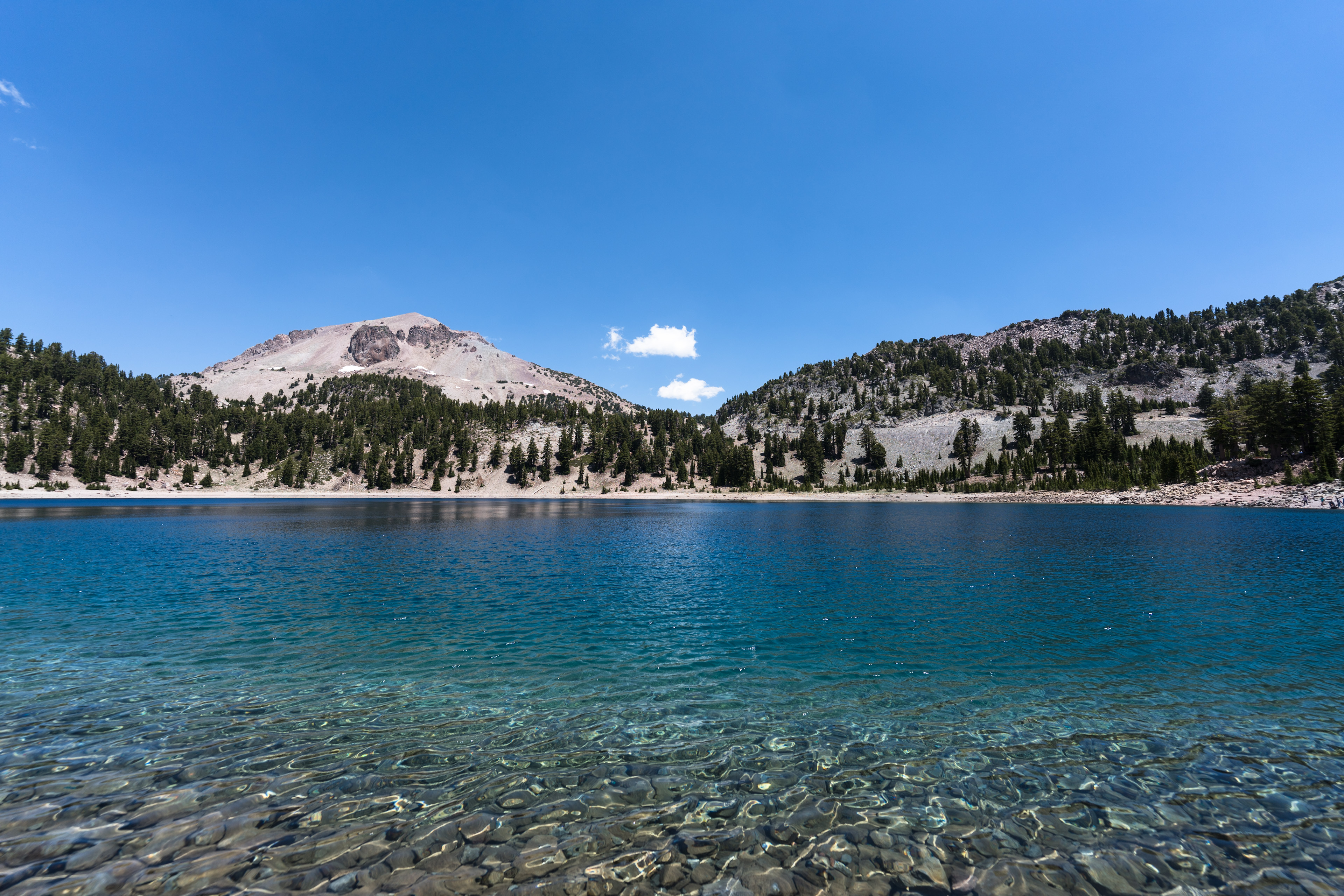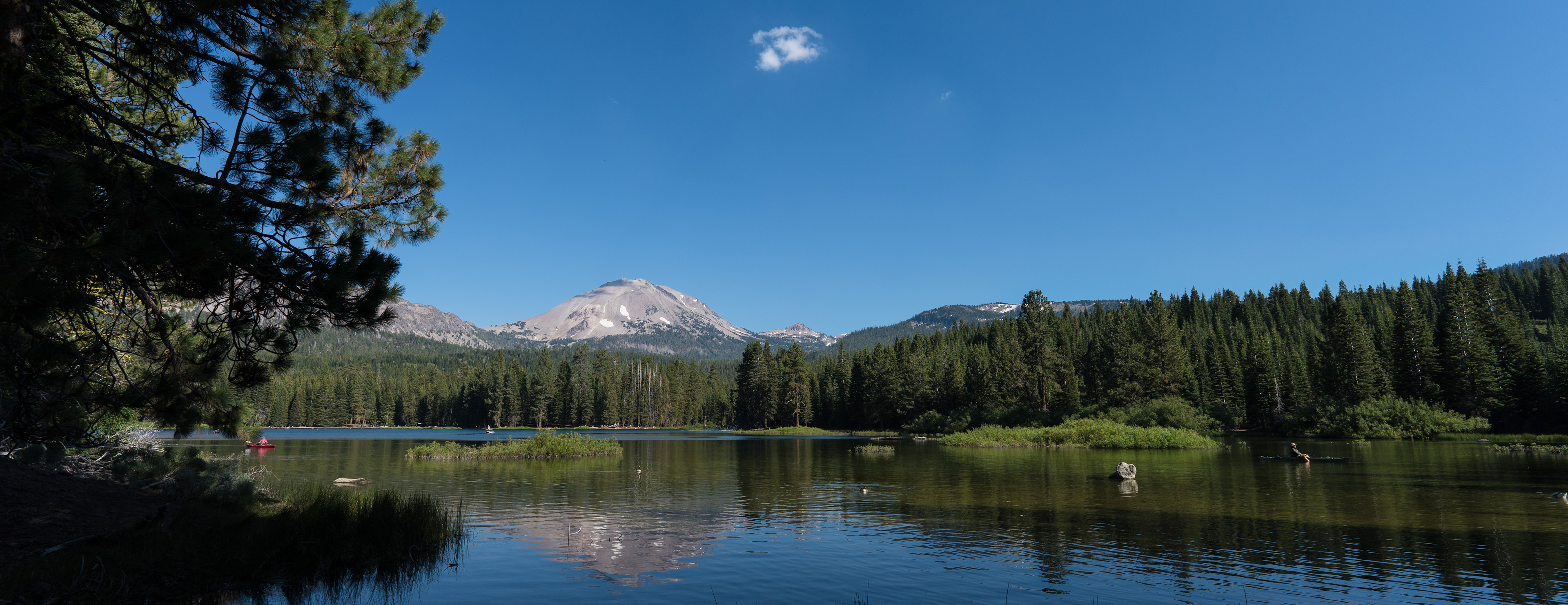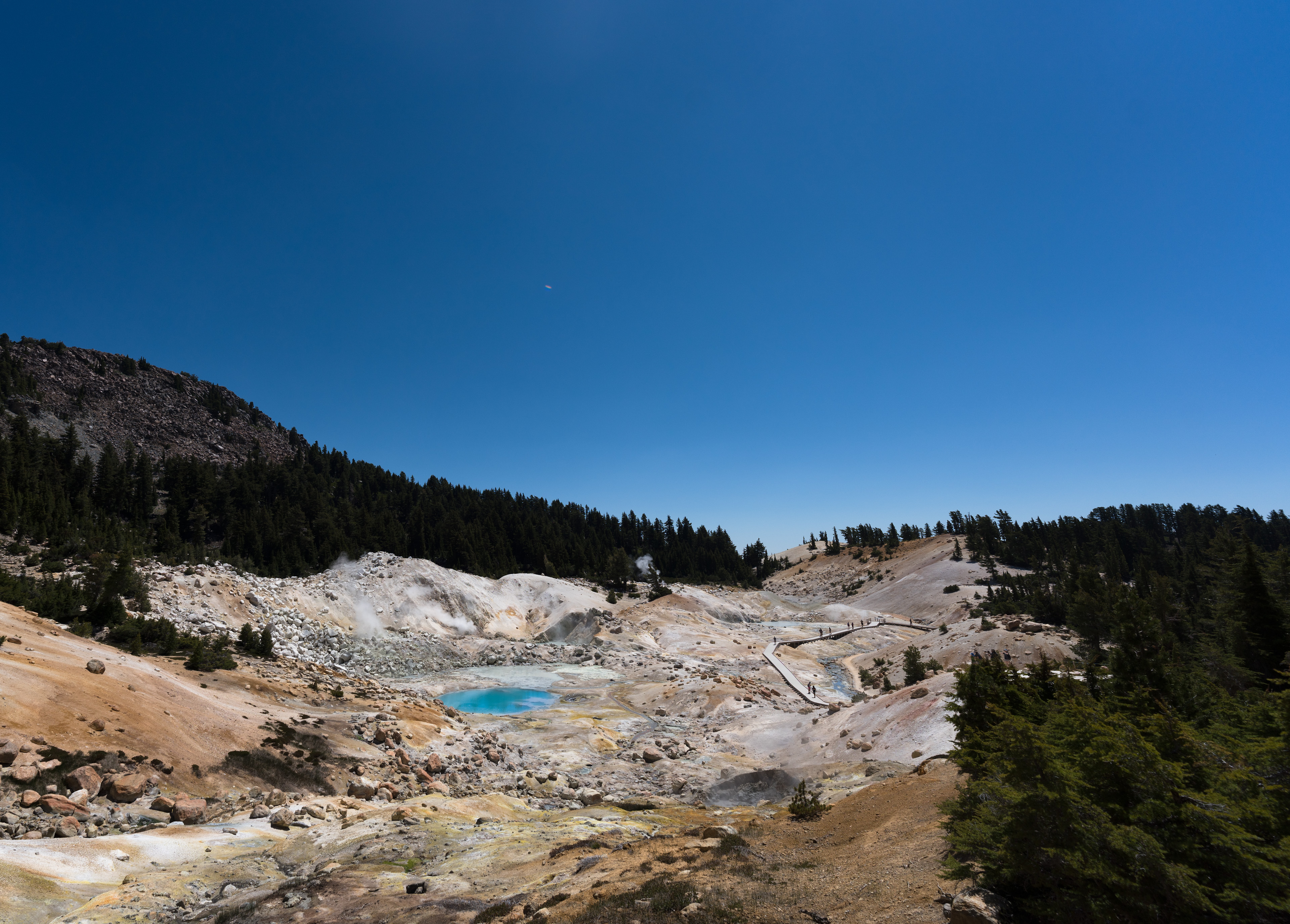 回到加州后,我们绕路在太浩湖边转了一圈,可惜时值旺季,完全无法停车,只能远眺那碧蓝的湖水聊以解馋。随后折向北边开往拉森火山国家公园。途中经过一座小镇加油,还从加油站大妈那里免费领到了卖不完的鸡条xD。拉森火山位于喀斯特山脉南端与内华达山脉北端的交汇地带。这里是美国仅有的两处能观察到裸露于地表的地热景观的国家公园(另一处是黄石);同时,这里也是世界上少数能同时找到所有类型的火山的地方(穹顶,盾状,火山渣锥,层状),其中公园主峰拉森峰还是世界上最大的穹顶火山。它至今仍在活动,而其在1914年的喷发则是美国本土倒数第二次火山喷发。